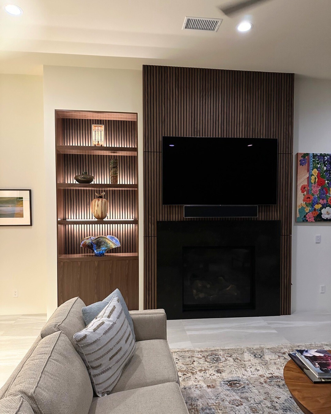 - LED edge-lit shelves Bookshelves Next to Fireplace Ideas