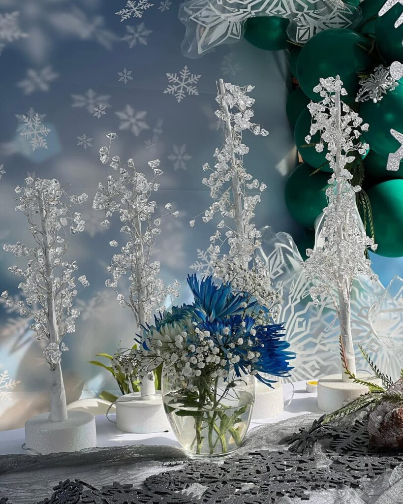 - Adorn with white, silver, and icy blue colors.