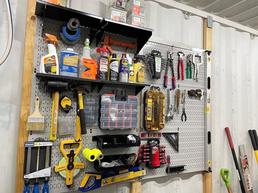 - Wall-mounted pegboard tool station