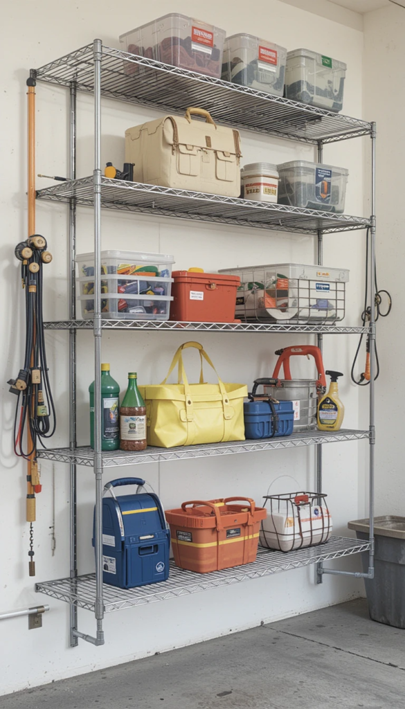 1. Wall-Mounted Metal Shelves – Sturdy and perfect for heavy tool storage.