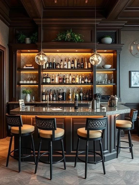 - Art Deco Bar – Incorporates geometric patterns, gold accents, and velvet textures for a 1920s-inspired appearance.