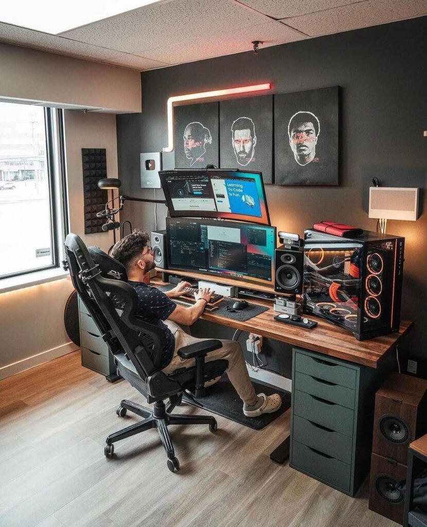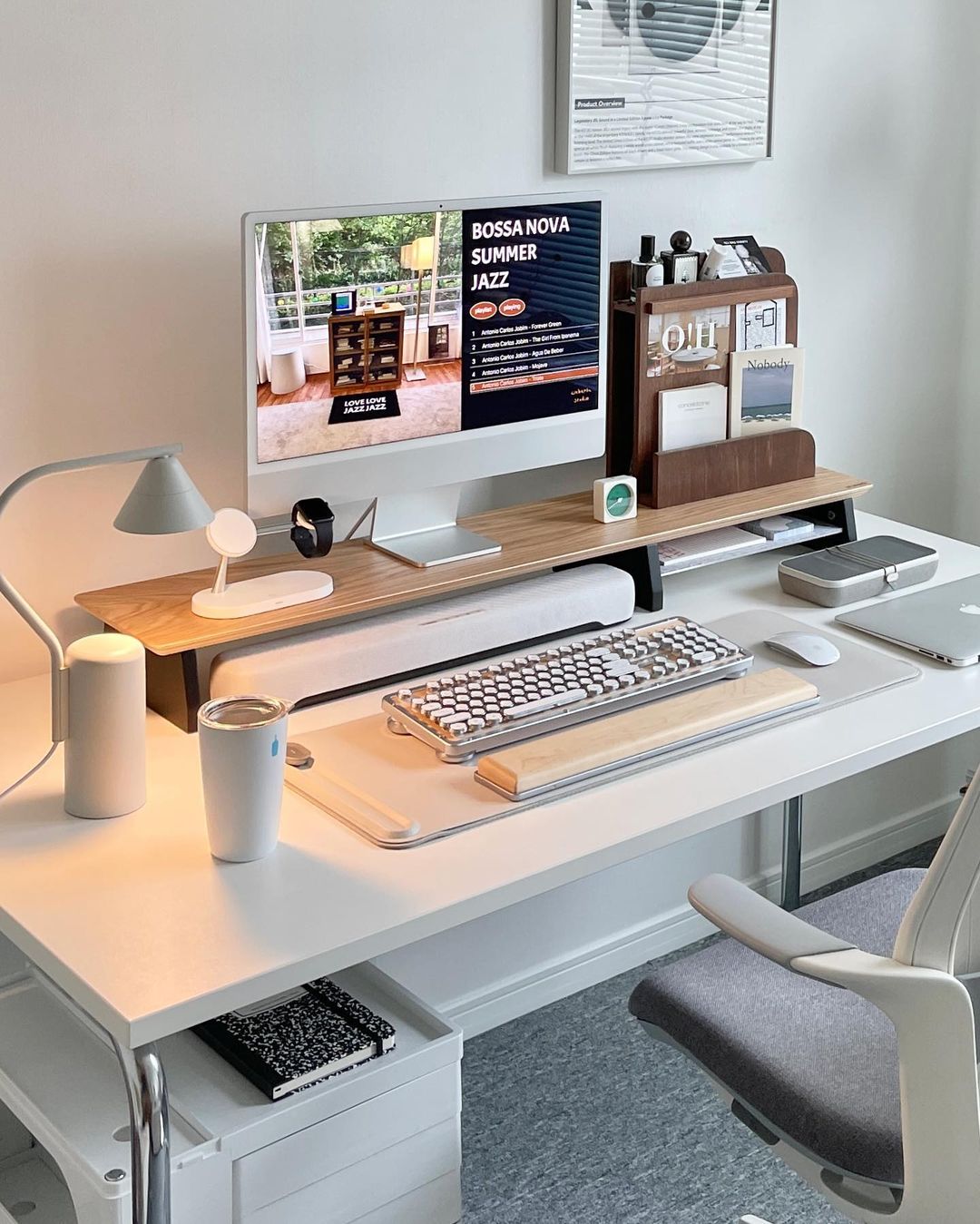 Think dual monitor, cable organizers, storage, and that kind of thing. Plants, inspirational art, and a clean desk can lift your mood and bring your questions into focus. Office setups are ideas that can turn even the tiniest of spaces into comfortable work areas for professionals, students, or creatives.