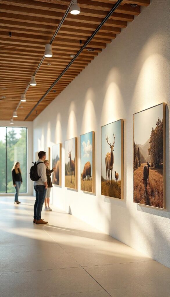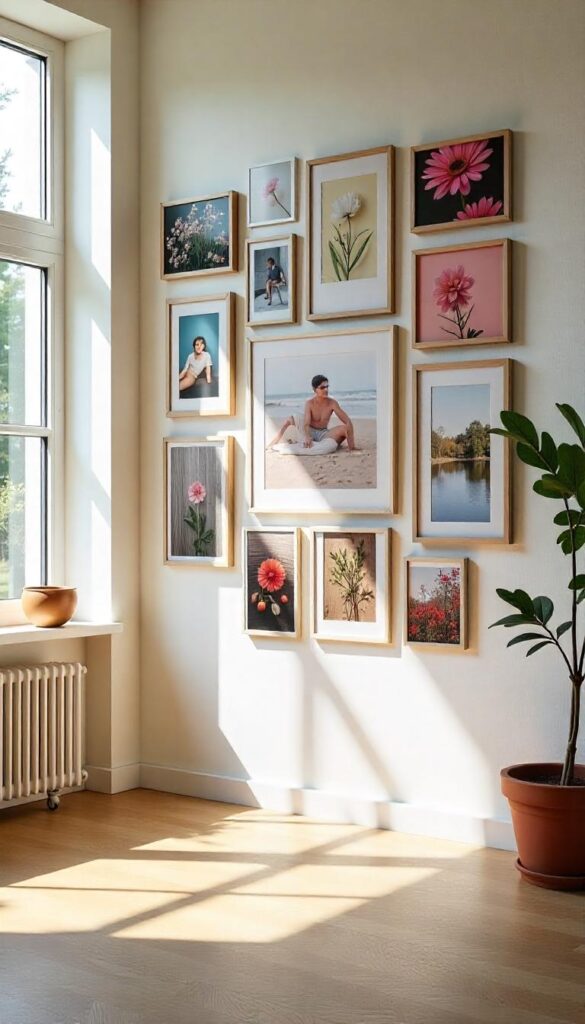 - Blend photo sizes and orchestrate from baseboard to ceiling.