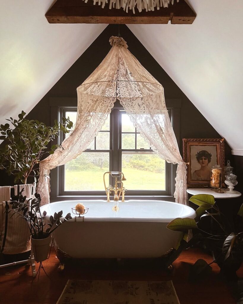 • The use of a patterned or clear curtain and vintage fixtures enhances the elegant look.