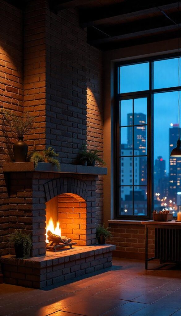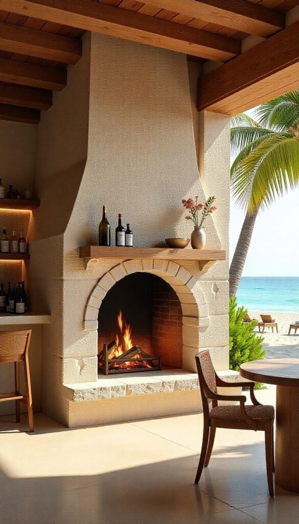 - Floor-to-ceiling fireplace with neutral stacked stone