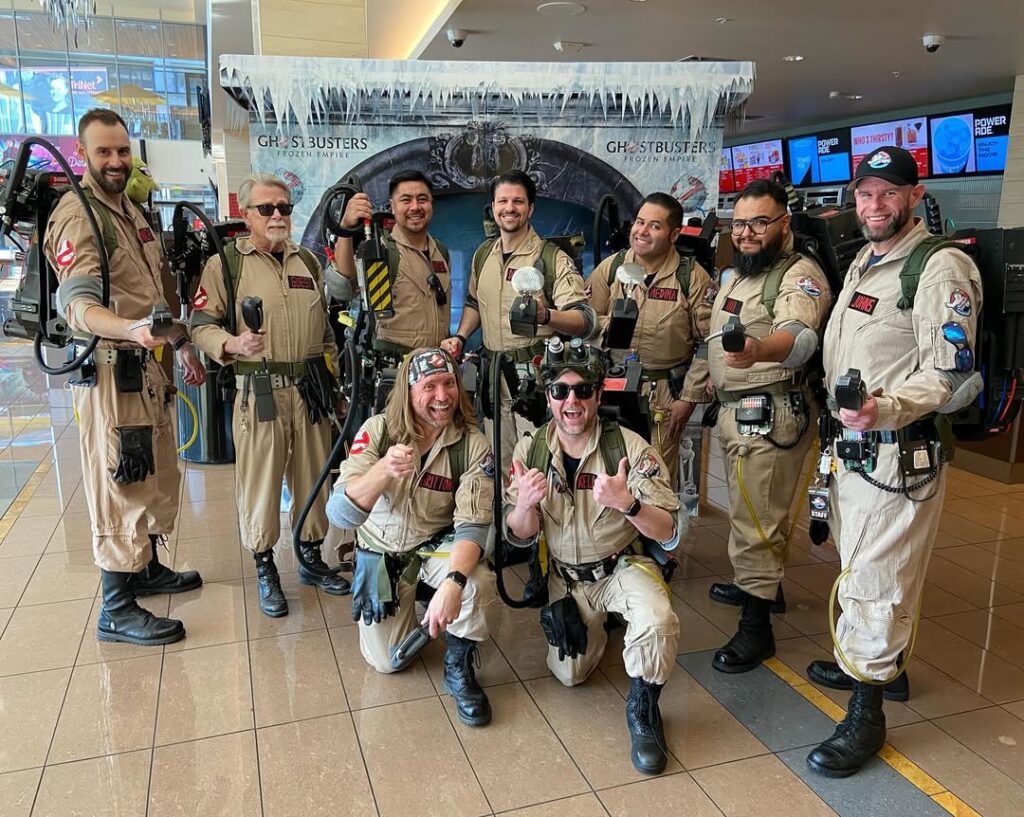 - Design approach: Tan jumpsuit, proton pack, and glasses.